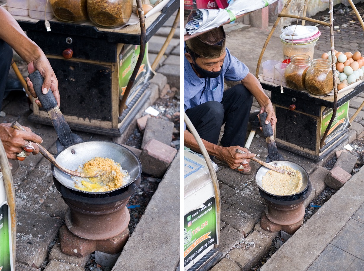 Faisol Yusuf, a long-standing kerak telor vendor, at work