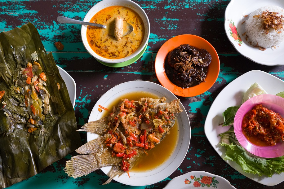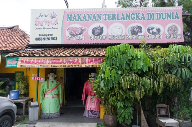 Bama and I headed out to the suburbs on Christmas Day, riding the spotless MRT to the end of the line at Lebak Bulus, where we switched to a ride-hailing service for the 20-minute drive to a no-nonsense Betawi restaurant just beyond city limits. Above the entrance, a banner and a much larger billboard, its colors badly faded after prolonged exposure to the tropical sun, proudly advertised “the rarest food in the world”. We opted for a low table by the window that called for a lesehan seating arrangement: taking off our shoes to dine cross-legged on thin mats, in this case covering a wooden platform raised off the ground.