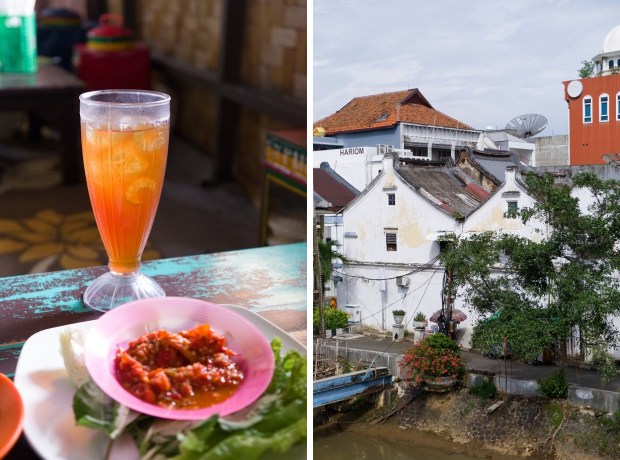 A glass of iced bir pletok; the side of an old Chinese shophouse in Pasar Baru