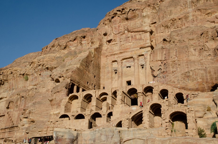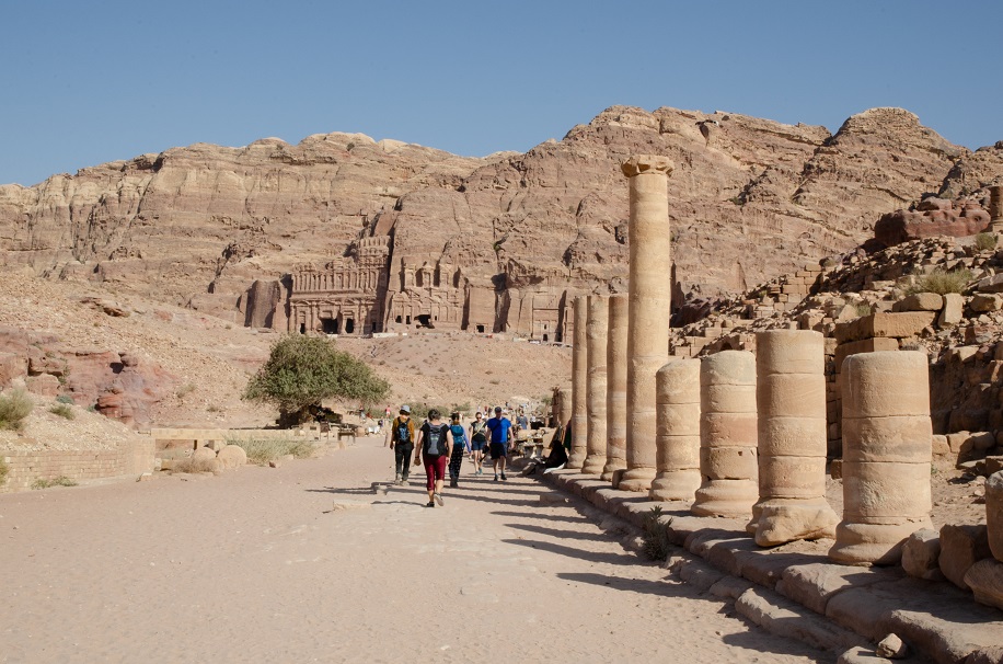 Hikers on the ad-Deir (Monastery) Trail; visitors dwarfed by the Monastery’s rock-cut façade