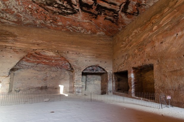 Much of our first afternoon in Petra is spent at the Royal Tombs on the western slope of the Jabal al-Khubtha massif. The first in a line of magnificent mausoleums punched out of the mountain, the Urn Tomb was so named for the distinctive jar that crowns its pediment. This 26-meter (85-foot) monument is thought to be the resting place of Malchus II, a Nabataean king who died in 70 AD, and can be reached via steps that traverse a double layer of Byzantine vaults known as as-Sijin, or “the Jail”. Wandering into the cool interior from a courtyard flanked by colonnaded porticos, our eyes are immediately drawn to the smooth ceiling high above our heads, decorated in the painterly hues of the exposed rock strata. The Urn Tomb’s chamber is almost square, measuring an impressive 19 by 17 meters (or 62 by 56 feet); it was eventually repurposed as a church in the mid-5th century, when a local bishop had three apses cut into the back wall.