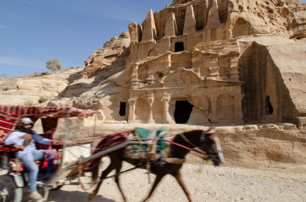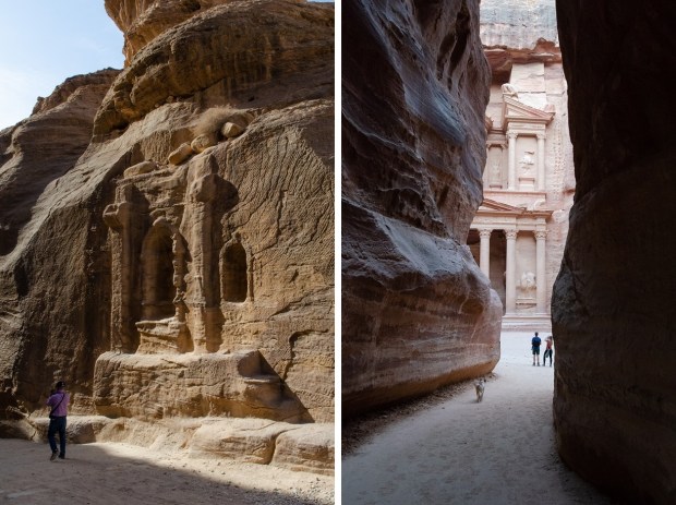 Bama and I have three days to explore the UNESCO World Heritage site on foot. We enter Petra the same way Burckhardt and the merchants of old did – through a parched valley that narrows to become the Siq. Stepping into this 1.2-kilometer (3,600-foot) canyon, a natural geological fault worn smooth by eons of wind and water erosion, feels like the start of a fantasy adventure on the silver screen. We march on between the remnants of a monumental archway destroyed by an earthquake in 1896, past votive niches and larger-than-life carvings of a camel caravan. Stretches of the original road still remain here: the well-worn flagstones were rediscovered only in the late 1990s. The clop-clop-clop of an oncoming horse-drawn buggy echoes off the towering sandstone walls.