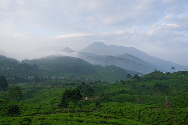 When we set out from the hotel after a pre-dawn breakfast of soft bread stuffed with chocolate and coconut jam, the sky in the east is beginning to redden. The mountains are but dark silhouettes, specks of light on their slopes marking out individual houses and Puncak’s landmark mosque. Just 25 minutes later, Bama drives us into an unpaved parking lot right off the main road near the crest of the pass. Our starting point lies at an elevation of 1,400 meters (just under 4,600 feet), and with fairly easy gradients for most of the way, the hike should be a less-than-demanding walk through a patchwork of working tea plantations. We’ll turn around at the trailhead for the climb up Mount Kencana, whose summit route opened to hikers only a few years ago.