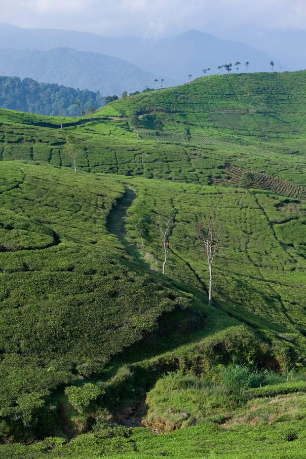 Bama and I find ourselves frequently stopping — not to catch our breaths but to soak up (and photograph) the beauty all around us. I’m captivated by the views back over the tea fields toward Gede and Pangrango under cloud-streaked skies, as the morning mist burns off a nearby hilltop crowned by two radio transmission towers. Rounding the next curve to reach a ridgeline, we’re suddenly struck by a painterly vista unfolding beyond a pair of trees, where the slope abruptly falls away. Neat rows of tea bushes march on and on across the rolling hills, following every contour and fold of the landscape. No longer obscured by the low clouds gathered atop a forested ridge, the rising sun bathes slivers of this bucolic scene in the golden light of dawn.