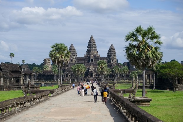 In early December, the start of dry season, the sugar palm-flecked plains around Siem Reap are a vast patchwork of flooded paddy fields the color of old parchment. From up high we see cotton candy–like clouds reflected in the calm waters of Tonle Sap, Southeast Asia’s largest lake and the repository for millions of gallons of excess water from the mighty Mekong. Our plane banks to starboard, revealing downtown Siem Reap’s red tiled roofs and tangle of newly resurfaced roads on the approach to the airport. The single runway points northeast, unlike the man-made incisions on the landscape left by ancient Khmer laborers, who dug massive rectangular reservoirs and moats around their great temples and walled capitals, all oriented east-west in a grand design that evolved over time in accordance with the whims of powerful rulers who styled themselves devaraja, god-kings.