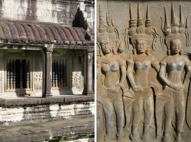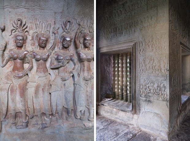 For now, the broad sandstone causeway over the moat is closed for restoration, so tourists are funneled onto a pontoon bridge whose modular plastic floats seem to rise or fall with every footstep. “My mom would be a little scared,” Bama says. Reaching the other side, we ooh and aah at sculptures of seven-headed naga serpents and beautifully carved devatas: celestial beings with exquisite headdresses, hairstyles, and jewelry mirroring those of real-life women in 12th-century Cambodia.