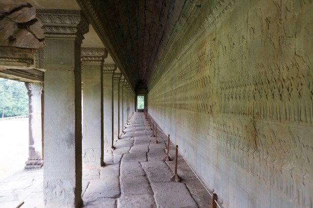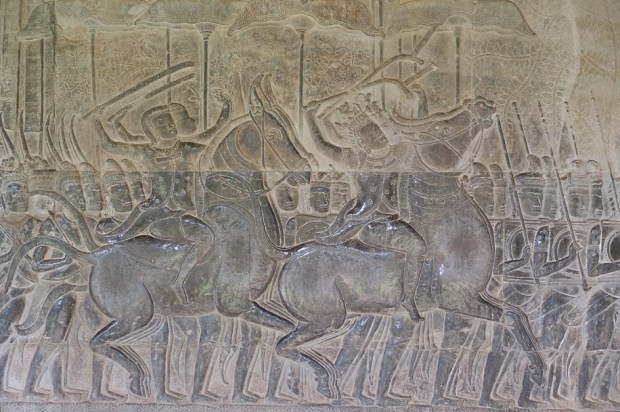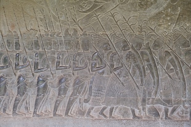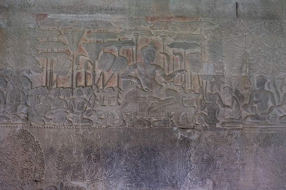 Going counter-clockwise from the west, Bama and I make a slow circuit around the bas-relief galleries, marveling at the rich tapestry of stories that covers an area of 1,200 square meters (about 12,900 square feet). There are pitched battles from the Mahabharata and Ramayana, Hindu epics still remembered in the traditional art forms of modern-day Southeast Asia. One long frieze immortalizes a triumphant procession with Suryavarman II himself, fanned by servants and shaded by more than a dozen parasols as he sits cross-legged on a wooden dais. Preceding him are courtiers and Khmer troops, military commanders riding on horses or elephants, and a contingent of Siamese mercenaries. A passing local guide points out the foreign fighters to the group of tourists in his charge. “The men who look like women are the Thais.” This is on account of their distinctive headgear, which has strands of beads falling behind the ears and a plant-like arrangement of feathers sprouting from a tiered cap. Then, a little farther on, we find a portrayal of 37 heavens and 32 hells according to the ancient Hindu texts known as the Puranas, showing sinners being punished (read: tortured) for their grievous misdeeds.