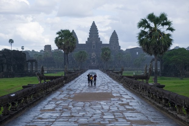Torrential downpours color the first of our three afternoons spent at Angkor Wat. We are stranded for some time in the cloisters of the highest level known as the Bakan, a place accessed via ludicrously steep wooden stairs. But the inclement weather also sets the scene for a few serendipitous moments. The skies unexpectedly open while we’re inside the galleries of the Western Gopura (gateway); it has the immediate effect of clearing the raised ceremonial causeway leading to the main temple of all other visitors, save three Cambodian youths huddled under a single umbrella, the lotus-bud towers behind them blurred by a curtain of raindrops. This composition becomes one of my favorite pictures from the whole trip. As we leave the central compound, a kind-hearted traveler with a German accent alerts us to the mirror-image of Angkor Wat revealed in large puddles on the 350-meter (1,148-foot) causeway. I crouch down to take photos as sunlight filters through the indigo-grey rainclouds, not knowing if these accidental reflecting pools will be gone by morning. ◊