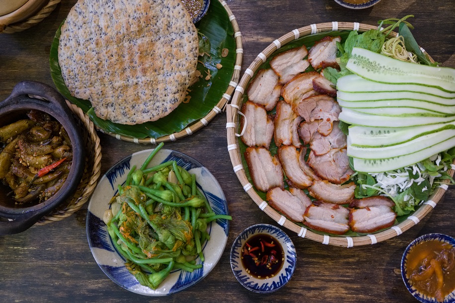 Food and heritage continue to be dominant themes when we move to District 3 upon returning from Quy Nhon. Just around the corner from the French-colonial Archbishop’s Residence, Cơm quê Mười Khó is a rustic, semi-outdoor restaurant specializing in the rural cuisine of central Quảng Nam province. Its clever use of the leftover space between two buildings draws us in for a fabulous lunch centered on rice-flour pancakes from the district of Đại Lộc. Softened in a bowl of water, they morph into a wrapping for DIY rolls stuffed with barbecued pork, herbs, and vegetables (thịt xíu cuốn bánh tráng Đại Lộc). We also order stir-fried pumpkin flowers with garlic (bông bí xào tỏi), fig salad (gỏi trái vả), goby braised in a claypot (cá bống kho tộ), and bowls of fluffy white rice. All this is washed down with nước sả tắc đường phèn—a thirst-quenching iced drink of kumquat, lemongrass, and rock sugar.