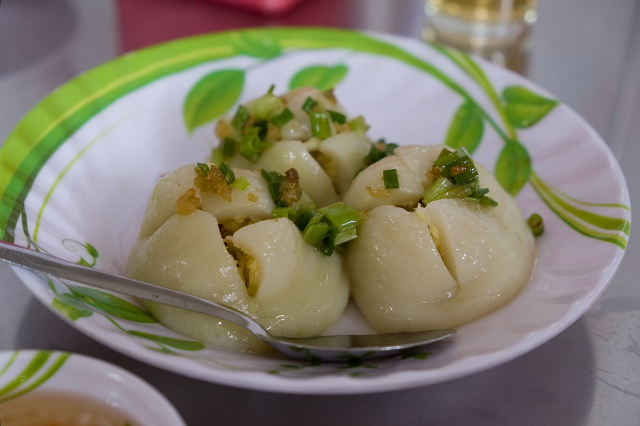 In the streets I overhear snippets of Cantonese being spoken by elderly residents, spot signs in traditional Chinese characters, and pass air-dried lap cheong sausages strung up outside open storefronts. The familiarity reaches its peak when Len brings Bama and I to Quán chè Hà Ký, an old-school dessert spot known for zimaawu, the thick black sesame soup I grew up eating at big family dinners in Hong Kong. “This tastes like my childhood,” I tell Len. Tacked to the wall above our table is a laminated menu written in Vietnamese and Chinese, chock-full with classic Cantonese sweet treats whose ingredients I instantly recognize: jujube, lotus seed, water chestnut, and snow fungus. “I’m the only one here who can’t read this menu,” Bama jokes. Bánh ích trần mặn, the final item listed under what Len describes as the snack section, piques my curiosity. It turns out to be savory-sweet sticky rice dumplings of mung bean paste and dried shrimp. Topped with chopped scallion and cut into quarters, the morsel is served alongside fish sauce with thin crinkle-cut slices of pickled carrot and radish—a reminder of exactly where we are in Southeast Asia.