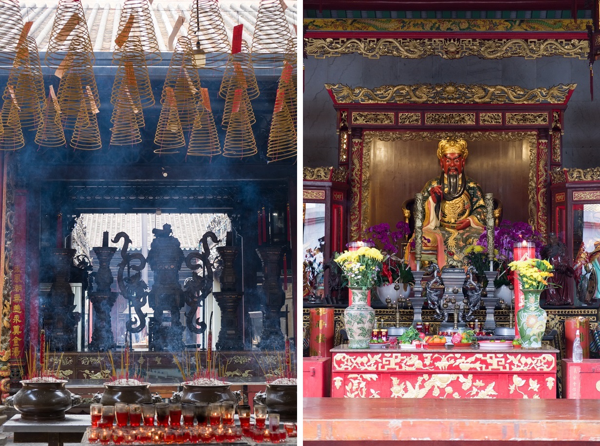 Just a few minutes’ walk down the road lies the newly renovated Guan Di Temple (a.k.a. Nghĩa An Assembly Hall). Built in 1819 by Teochew émigrés from the region around Chaozhou in eastern Guangdong province, the structure enshrines a red-faced statue of Guan Yu, a deified general who lived during the twilight years of the Han Dynasty. Schoolchildren across modern-day China know him as a powerful hero in the 14th-century historical novel Romance of the Three Kingdoms. After strolling past discarded timber beams piled up in the courtyard out front, the telltale smell of fresh paint greets us as we step over the temple’s threshold. Bama and I crane our necks at the exquisite woodcarvings now gleaming in vibrant colors, and take in intricately painted door gods that look as good as new. The time-worn Thien Hau Temple could do with a similar facelift.