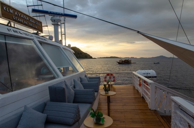 Somewhere in the waters of eastern Indonesia’s Komodo National Park, I tried to steady my camera while bouncing over the waves on a motorized rubber boat making circles around the Ayana Lako di’a, the early morning sunlight reflecting off its gleaming whitewashed hull. It was May 2019 and a last-minute work assignment had brought me an overnight cruise aboard this nine-cabin ship by the local Ayana hotel brand. The name Lako di’a means “safe journey” in the Manggarai language of nearby Flores — a long, thin, and mountainous island slightly larger than Connecticut (or about the size of Montenegro).