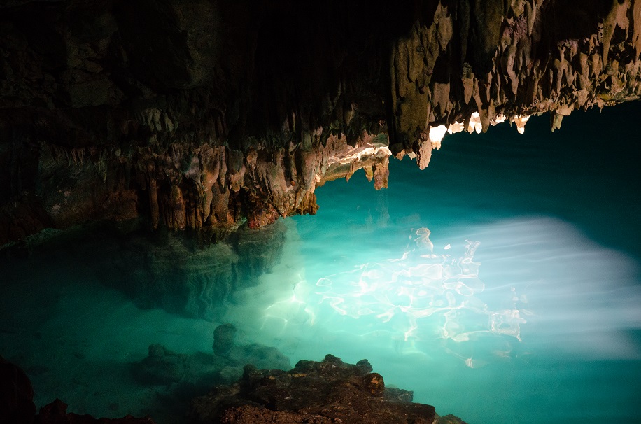 A pod of dolphins swam alongside our rubber boat for part of the journey back to the Lako di’a. I had already packed my bags, for the Ayana resort’s glass-bottomed vessel was now on its way to pick us up. All too soon it was time to bid farewell to Captain Nasrul, Ferdinandus, Deni, and the rest of the smiling crew. (If only the cruise could have lasted just a few hours longer…) That afternoon, following a light lunch ashore, Tama and I reunited with Yanus, the same driver who had taken us into the mountains. This time we sped along Flores’ northern coast to Tanjung Boleng village, where a boatman ferried the three of us to a jungled peninsula on the same bay. From the wooden pier, a short, signposted trail led to the not-so-secret sea cave and swimming hole known as Gua Rangko. We descended the bamboo ladder at Gua Rangko’s mouth and stopped in our tracks: at that hour, the sun reached so deep into the cave it illuminated a patch of the clear turquoise water and the sandy bottom. Reflected daylight danced across the stalactites on the ceiling. Tama clambered down the steep, rocky slope, picking his way around stalagmites to reach the pool’s edge for a relaxing swim. It was a final treat before our flight home the next morning.
