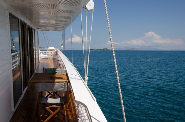 I soon left my quarters to explore the rest of the Lako di’a. On the upper deck, the door to the bridge was wide open and I gingerly stepped inside to take stock of the various screens, knobs, dials, keyboards, and charts arranged around the ship’s wheel. Captain Nasrul, a serious-faced but friendly man, invited me to sit down and have a go at the controls. “Oh, there’s no need, Captain,” I politely replied, “I’m too rough.” Behind the bridge lay a well-furnished dining room and lounge with sofas and padded armchairs. At the back of the space, a spiral staircase topped by a hatch led to an astroturfed roof deck, where soft loungers and a six-seater dining table had been laid out.