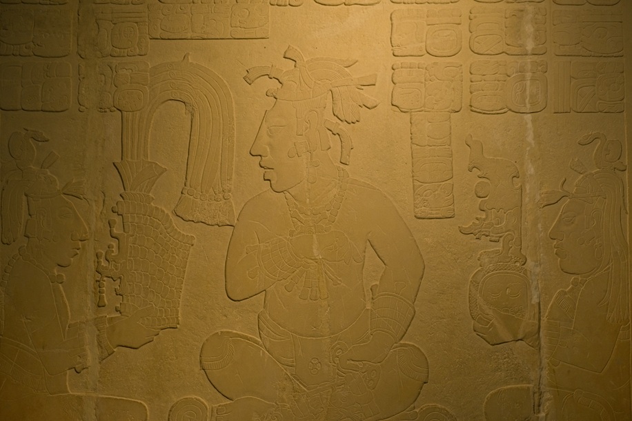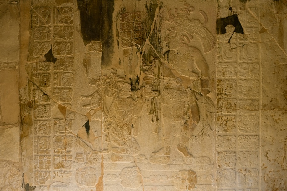 A carved tablet inside Temple XIV showing Kʼinich Kan Bahlam II and his mother