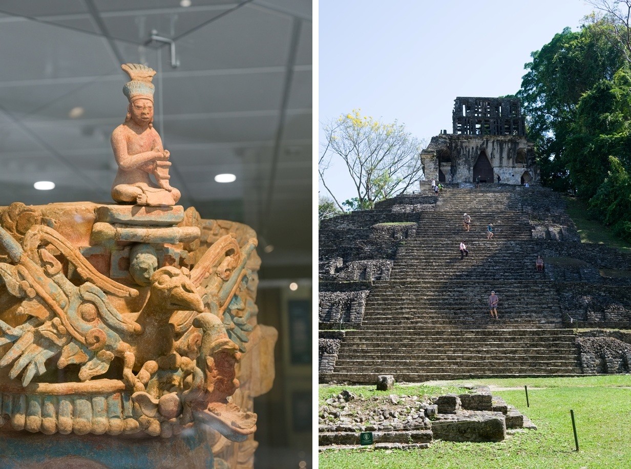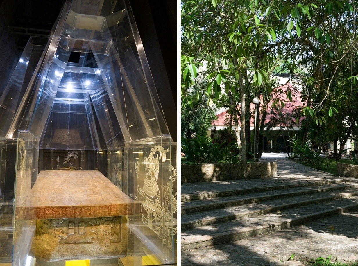The Site Museumʼs replica of Pakal the Greatʼs sarcophagus; the museum entrance
