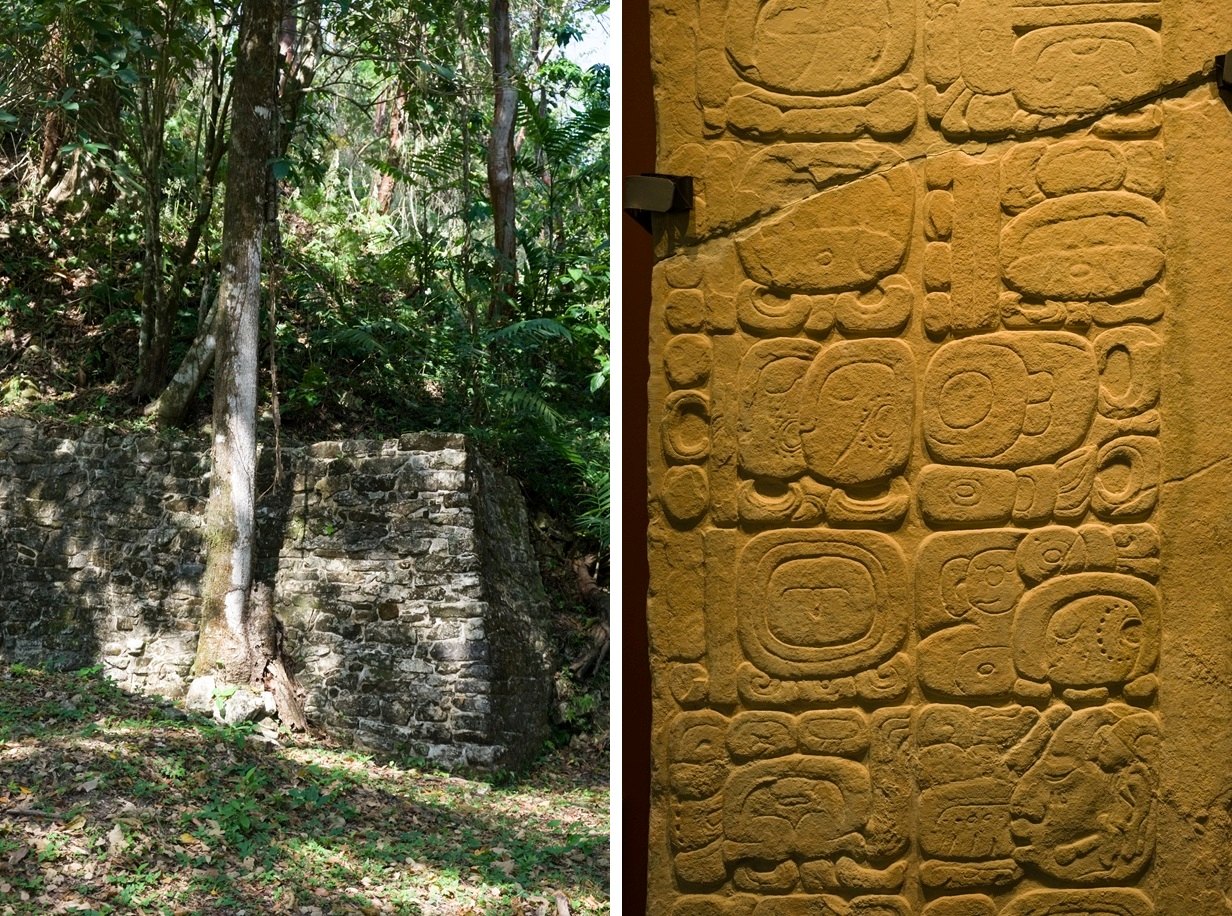 A corner of the unexcavated Temple XI; glyphs at the museum